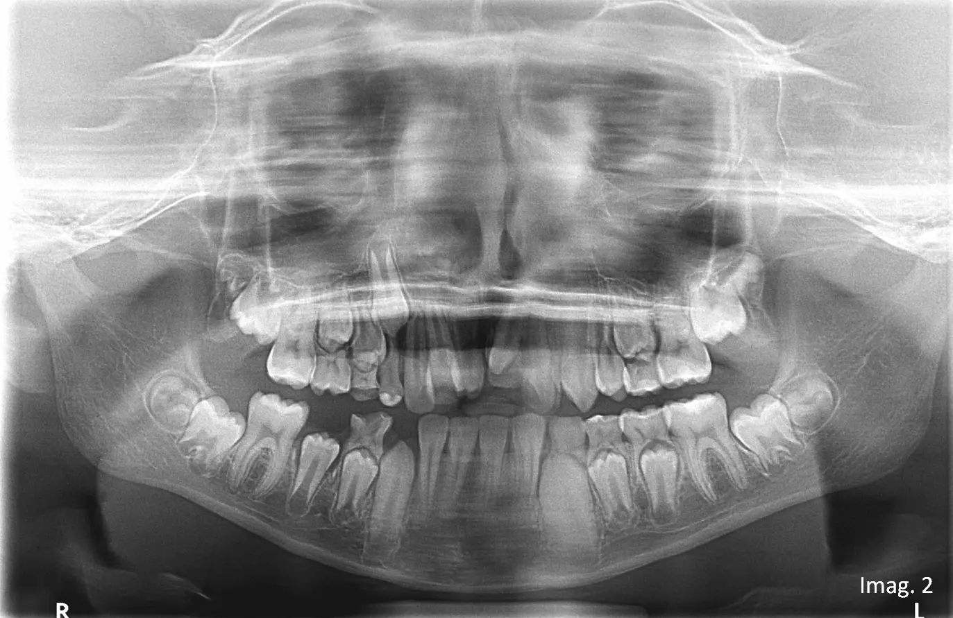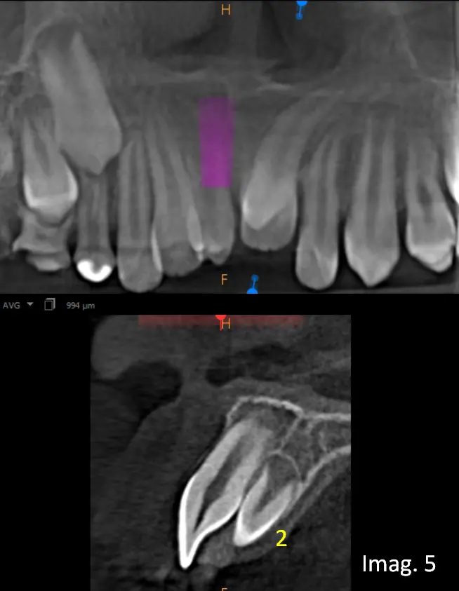 (Imagen 2). Dada la limitación inherente del estudio bidimensional para determinar con exactitud la posición vestíbulo-palatina, la orientación tridimensional y la posible presencia de piezas adicionales, se indica estudio tomográfico.