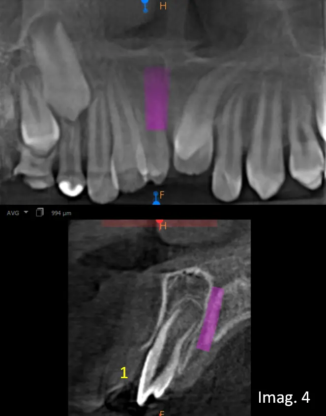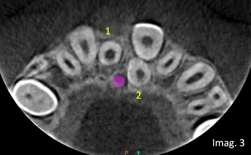 ​En el estudio tridimensional se confirma la presencia del Mesiodens clínicamente observable y además se identifica un segundo Mesiodens incluido, no detectable en el estudio panorámico inicial (ver imagen 3, vista axial).