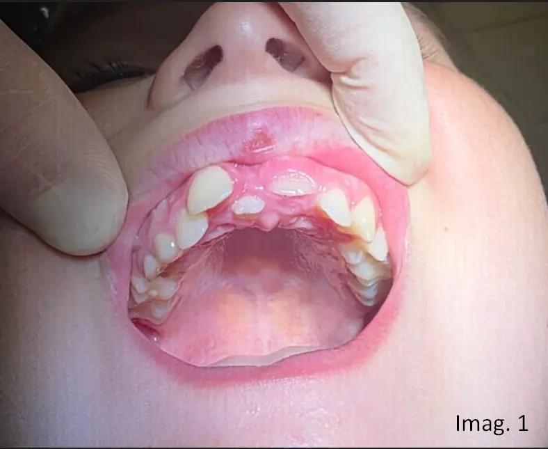 ​En el examen clínico intraoral se observa pieza dentaria supernumeraria en región interincisiva superior, compatible con Mesiodens erupcionado (Imagen 1).