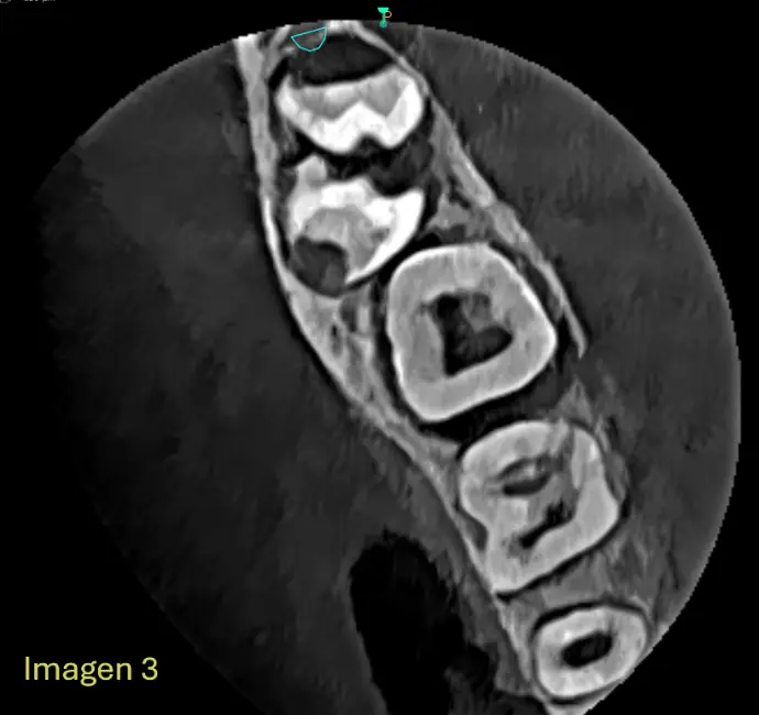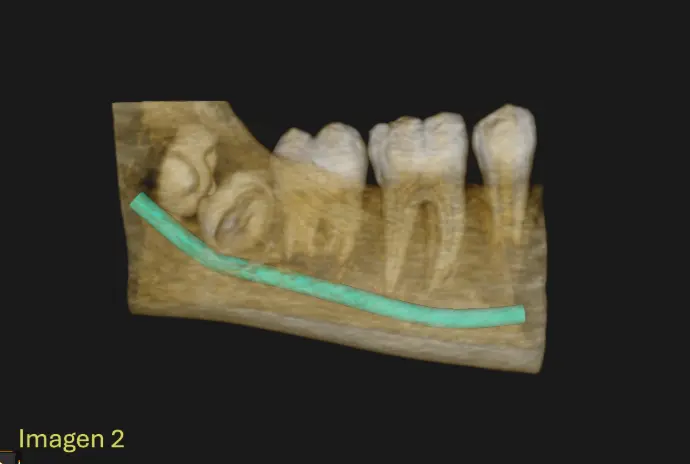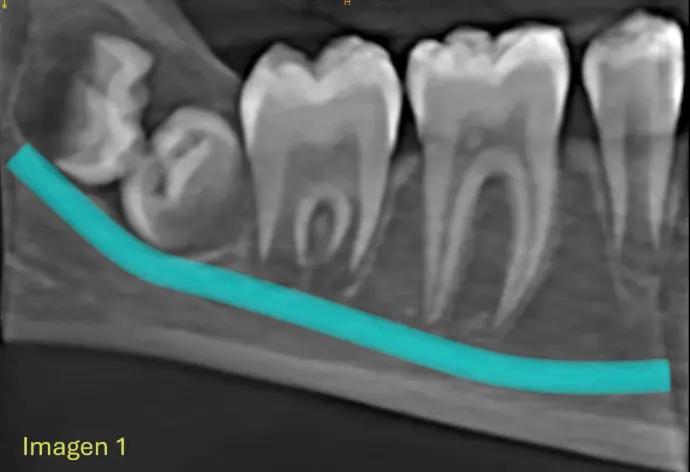 ​Paciente concurre en compañía de su madre para evaluar una posible retención dentaria en el sector posterior derecho de la mandíbula. Refiere antecedentes de controles odontológicos periódicos sin patologías relevantes, pero si presenta una molestia en zona mencionada anteriormente. Se requiere saber la posición de los terceros molares, dada la falta de erupción y la sospecha clínica de inclusión. Por lo cual se le realiza una tomografía cone beam sectorizada (IMG. 1) y encontramos que