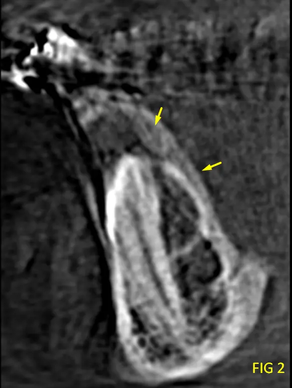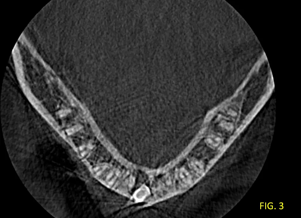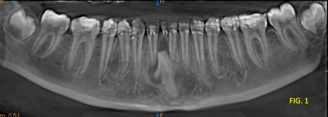 Motivo de consulta: remitido CBCT para evaluación de pieza dentaria supernumeraria en zona anterior del maxilar inferior.