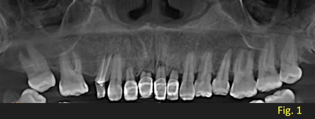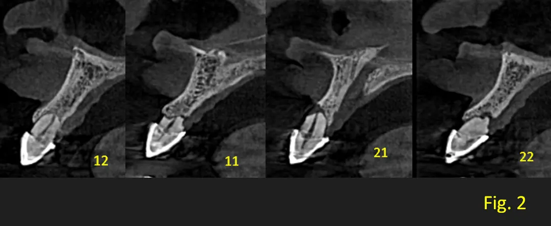 En una vista panoramica se observa que los apices de los incisivos centrales y laterales presentan una forma redondeada y corta. Pieza dentaria 2.1 presenta proceso de reabosción debido a que sigue con los patrones rectos y marcados como podemos visualizar en los cortes transaxiales (ver Fig. 1 y 2). Signos radiograficamente compatibles con Displasia dentinaria tipo 1.