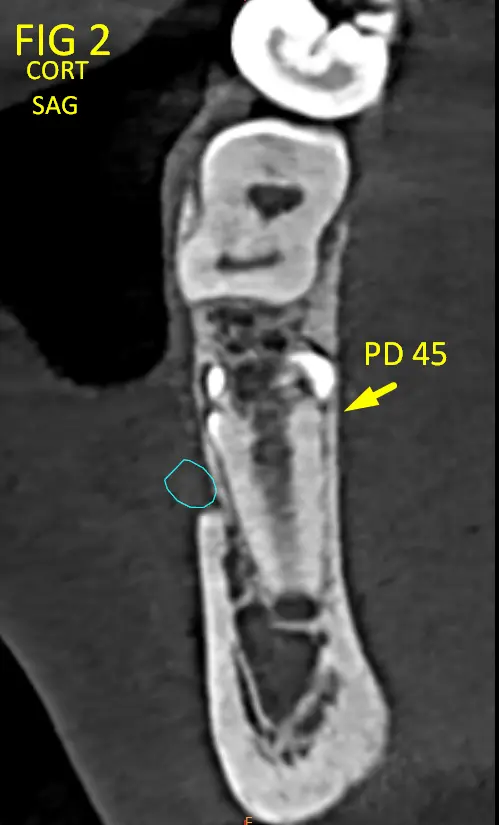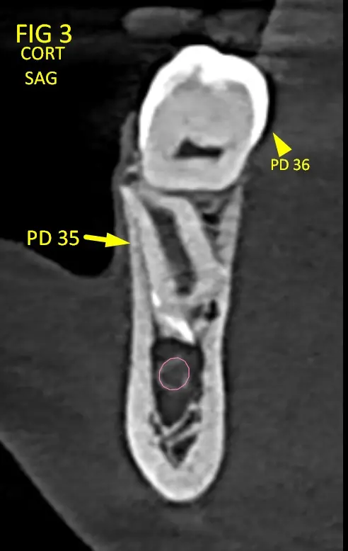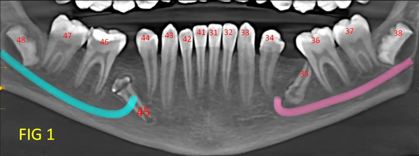 • Pieza 35(Fig. 3) (Fig. 3B): retenida, con orientación en retroversión hacia la base mandibular.