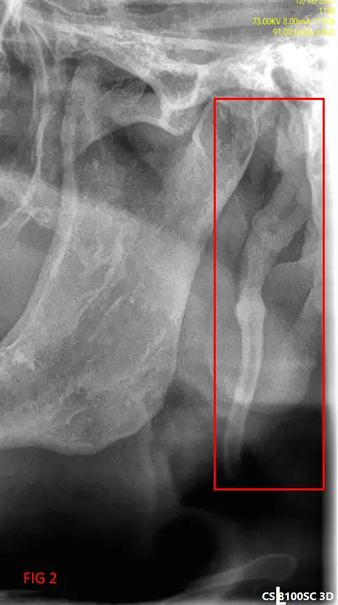 ​En el análisis de la ortopantomografía, se identifican estructuras radiopacas bilaterales de morfología alargada. Estas formaciones se extienden desde la base del cráneo (apófisis estiloides) con una trayectoria descendente y anterior hacia el hueso hioides (FIG 1, 2 y 3). Basándose en las características imagenológicas, se concluye que se trata de una osificación bilateral del ligamento estilohioideo, un hallazgo que suele presentarse de forma incidental