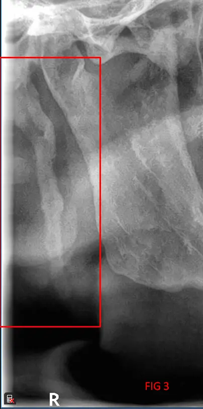 ​En el análisis de la ortopantomografía, se identifican estructuras radiopacas bilaterales de morfología alargada. Estas formaciones se extienden desde la base del cráneo (apófisis estiloides) con una trayectoria descendente y anterior hacia el hueso hioides (FIG 1, 2 y 3). Basándose en las características imagenológicas, se concluye que se trata de una osificación bilateral del ligamento estilohioideo, un hallazgo que suele presentarse de forma incidental